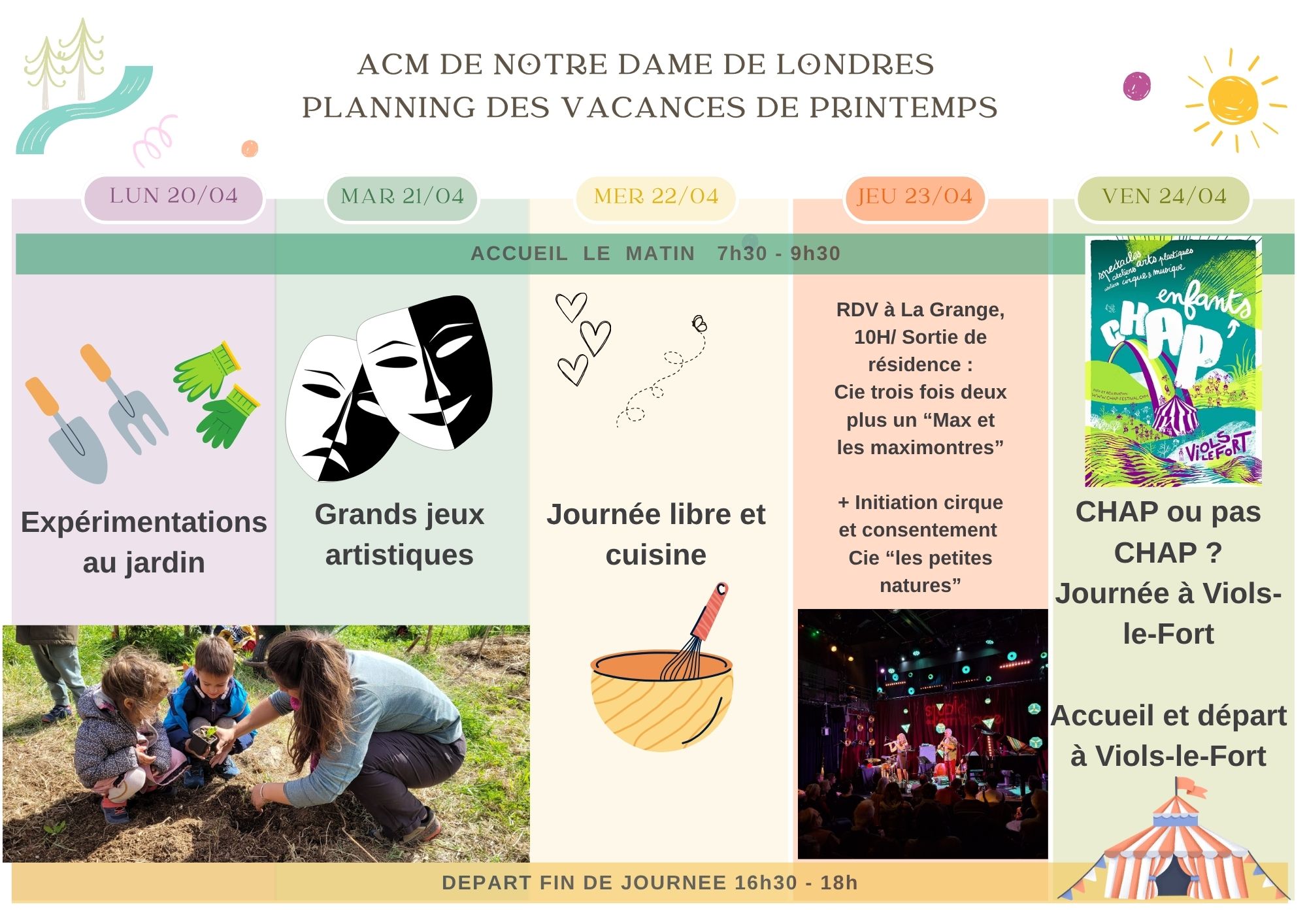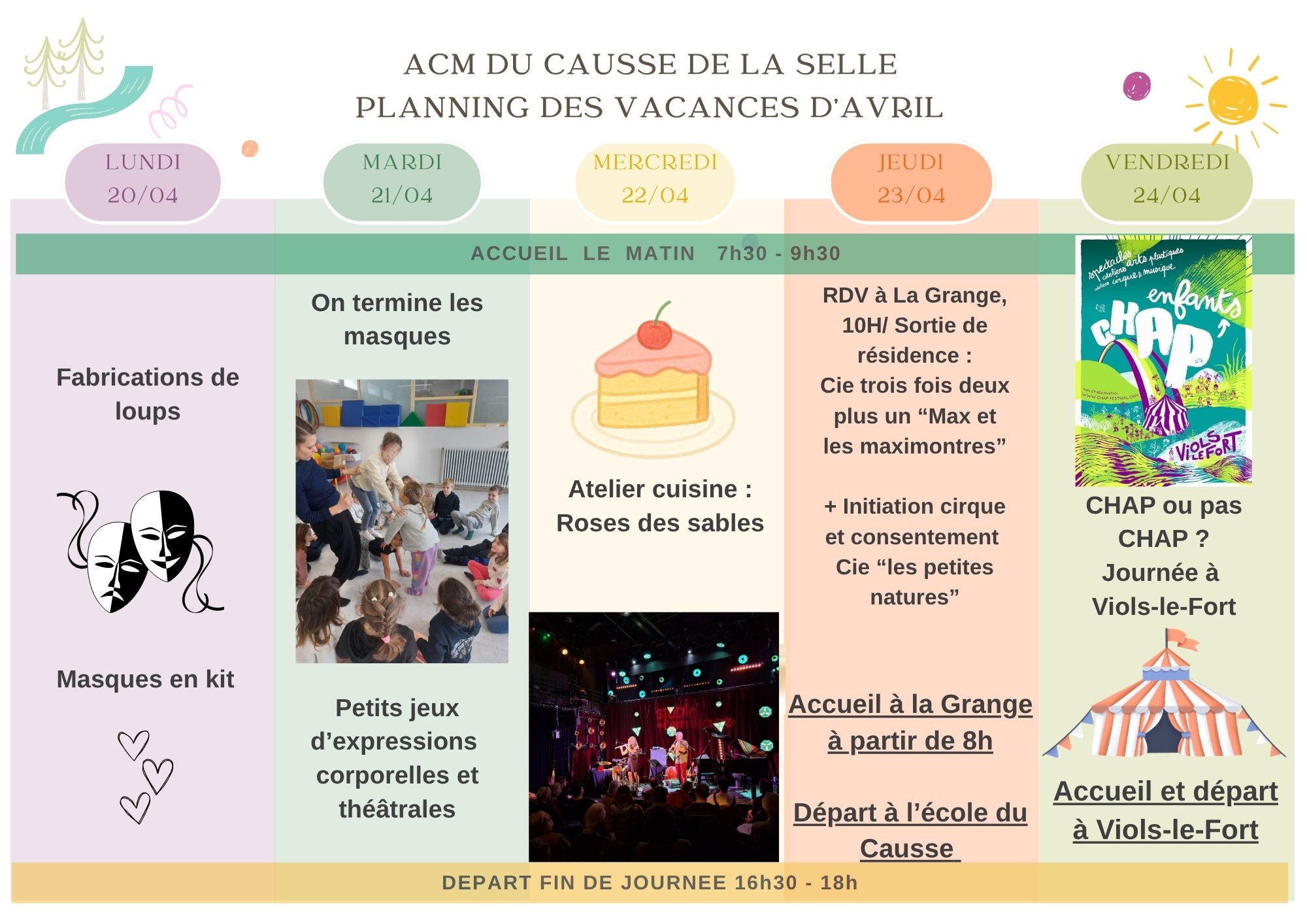 AU PROGRAMME pour les 2 accueils de loisirs : des jeux d’expression corporelles et théâtrales, la découverte des arts du spectacle et du cirque, un atelier de fabrication de masques, des rencontres avec des artistes, des pestacles… Mais aussi des jeux coopératifs, des activités de plein air, des ateliers goûters et des activités au jardin !
